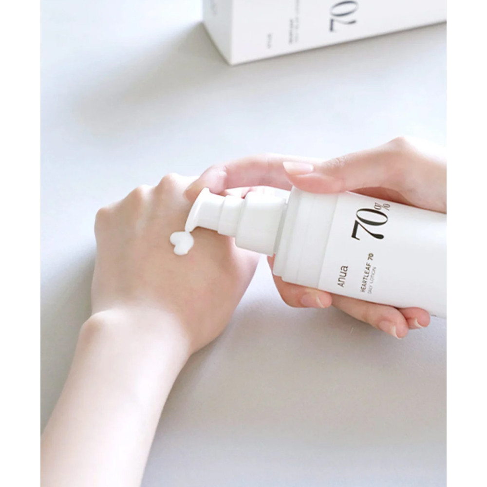 Die Anua Heartleaf 70% Daily Relief Lotion verschmilzt mühelos mit Ihrer Haut und spendet lang anhaltende Feuchtigkeit ohne fettige Rückstände. Die leichte Textur zieht schnell ein und spendet den ganzen Tag lang Feuchtigkeit für eine glatte, geschmeidige Haut.