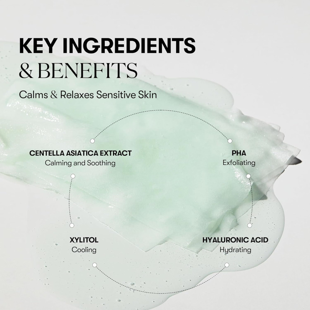 Milde, beruhigende Riesen-Toner-Pads mit Centella, PHA und Hyaluronsäure, die die Haut kühlen, mit Feuchtigkeit versorgen und auf ein glattes, Make-up-fertiges Finish vorbereiten - 100 übergroße Tücher in jeder Wanne.