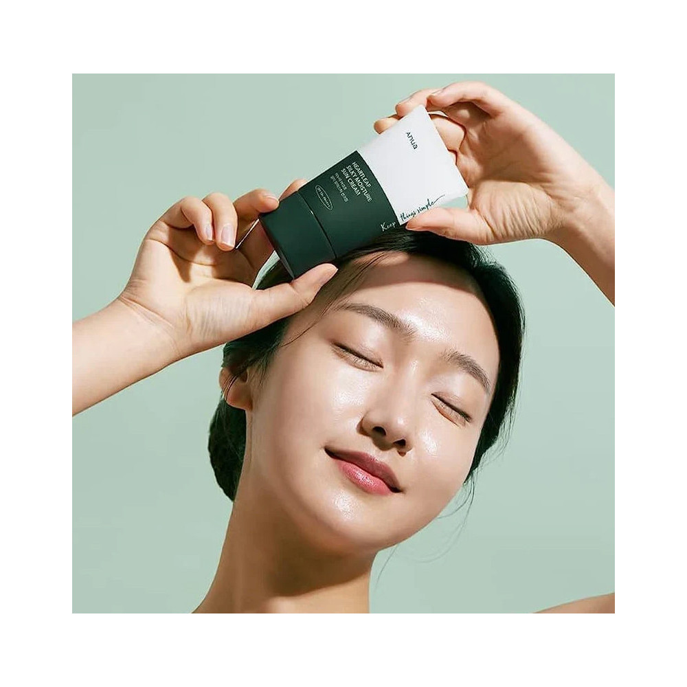 Veganer chemischer Sonnenschutz aus Südkorea mit SPF 50+ PA++++ Breitspektrumschutz, der empfindliche Haut mit Herzblattextrakt und Panthenol beruhigt, mit Feuchtigkeit versorgt und mattiert.